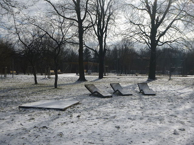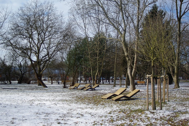 Tak jakoś wyszło, że granica zimy z wiosną była po dziesiątej, a ja byłam po dziewiątej. Tym bardziej symboliczne, że śnieg po jakimś czasie zaczął topnieć. Leżaczki w odnowionym skwerze we Włochach sympatyczne, ale park wydaje się zrobiony bardziej oszczędnie niż to było w wizualizacjach. Jeszcze coś z niego później wrzucę. Dziś tylko leżaczki do wygrzewania i łapania witaminy D.